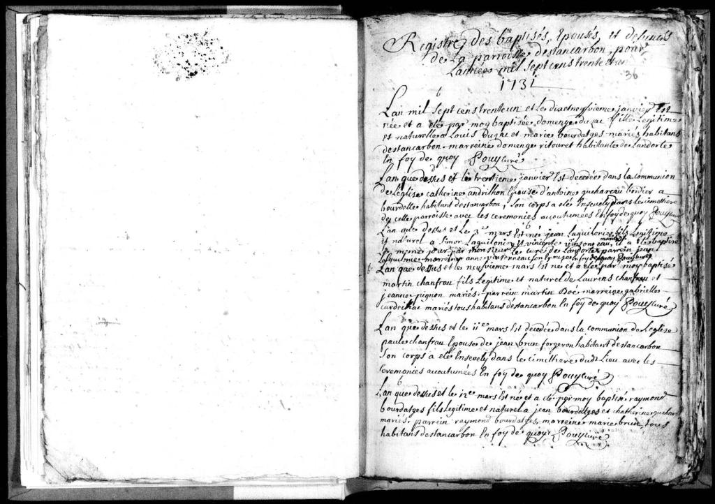 « L’an que dessus(1731) et le 12-è mars est né et a été par moy baptisé raymond bourdatges fils légitime et naturel à jean bourdatges et catherine guchareau mariés. Parrein raymond bourdatges, marreine marie brun, tous deux habitants d’estancarbon. En foy de quoy Pouy curé » – Registre d’état civil, Estancarbon, France. Archives départementales de la Haute-Garonne; page 42 de 271.